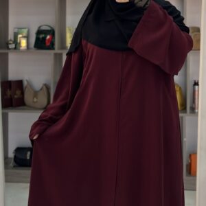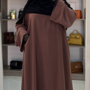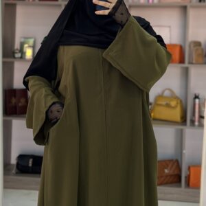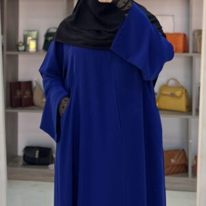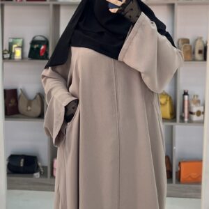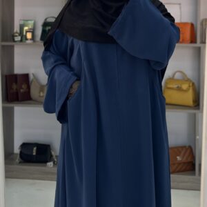 كما أن التصميم يتضمن جيوب جانبية، مما يضفي مزيدًا من العملية على العباية.
